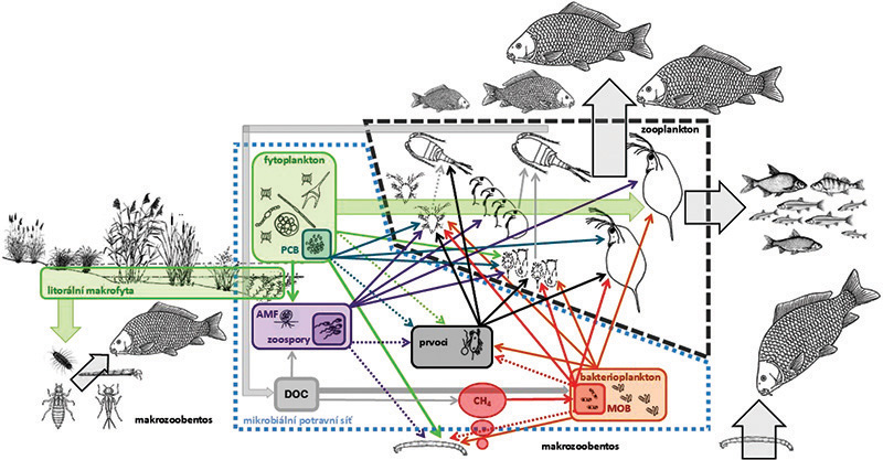 Obr. 1. Schematické znázornění hlavních složek a toků živin a energie v ekosystému rybníka. Vlevo litorální společenstvo, centrální panel představuje hlavní složky planktonního společenstva (DOC – rozpuštěný organický uhlík, PCB – pikosinice, AMF – vodní mikromycety a oomycety, CH4 – metan, MOB – metanoxidující bakterie). Přirozená produkce ryb závisí především na primární produkci fytoplanktonu a litorální vegetace (zelené šipky), případně na mikrobiální produkci (ve světlemodrém rámečku), transformované planktonními korýši a makrozoobentosem (černé šipky) do produkce kapra – podrobnější popis potravních vztahů v textu