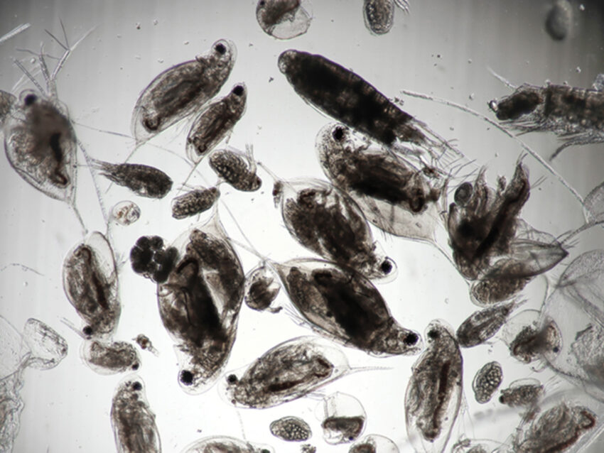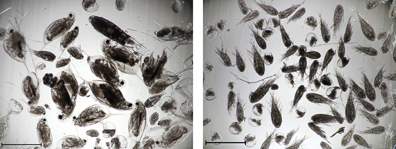 Obr. 2. Mikrofotografie typického rybničního zooplanktonu – tzv. hrubý zooplankton s převahou velkých perlooček (Daphnia gr. longispina, období čiré vody) vlevo, střední zooplankton tvořený kopepoditovými stádii buchanek a drobnými perloočkami (Bosmina spp.) vpravo, úsečka představuje měřítko 1 mm. Foto: Martin Bláha